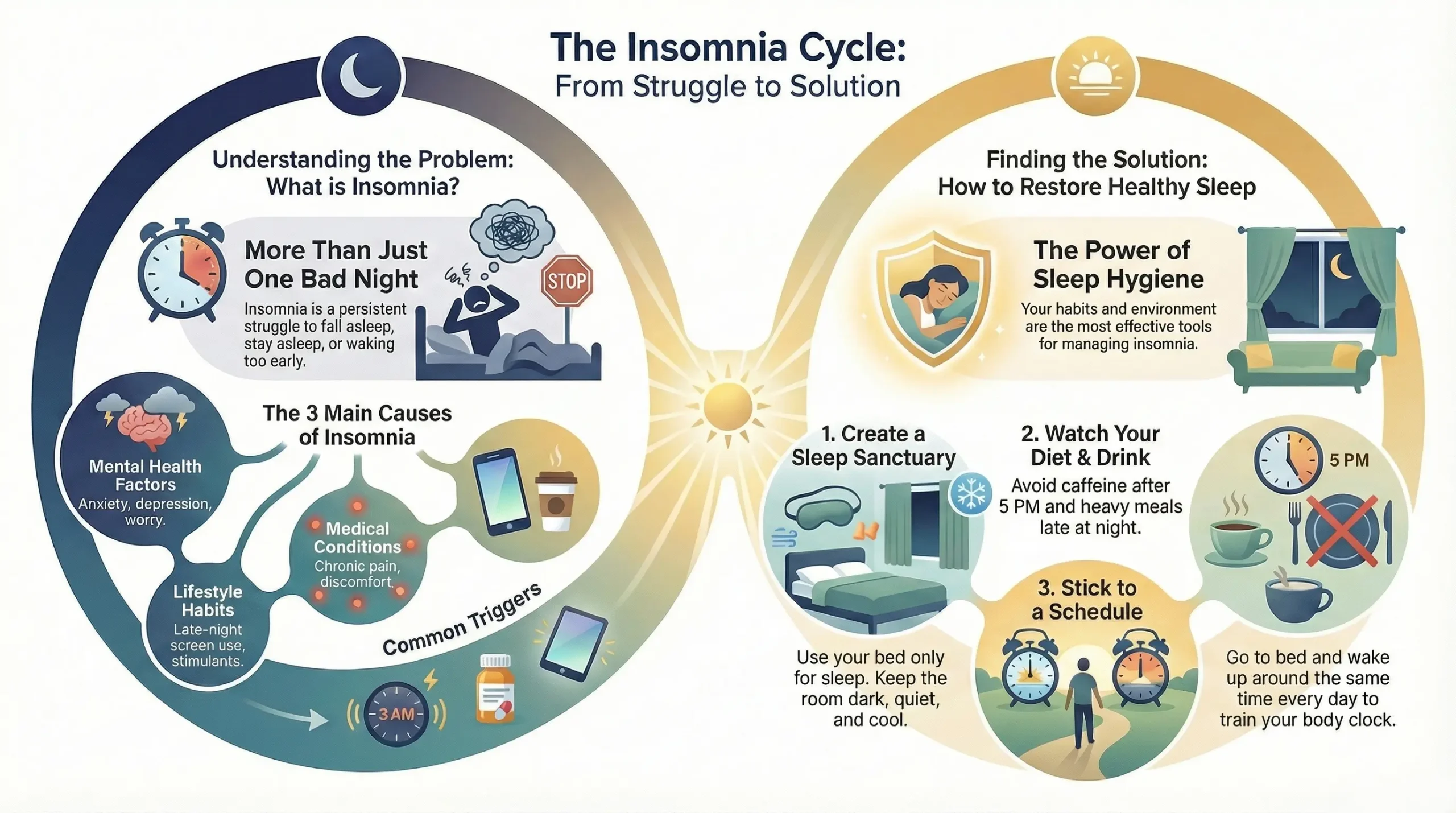 Insomnia is not just a nighttime issue. it is a condition that affects daytime functioning, emotional health, and overall well-being. While occasional sleep disturbance is normal, persistent insomnia deserves attention. With proper awareness, improved sleep habits, and timely support, healthy sleep can be restored.
